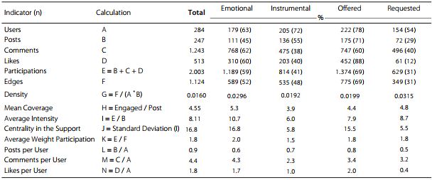 When comparing the types of support, Instrumental Support was 14.5% greater than the Emotional Support in number of participants and 22.5% greater in number of support units (posts). However, the average breadth and the average intensity of the support units were 35.9% and 78.3% higher in the Emotional Support, respectively. In the distribution in participations, greater homogeneity in the Instrumental Support was perceived, with standard deviation of 5.8 in intensity versus 16.8 in Emotional Support. When analyzing the types of participation, it was found that the Emotional Support is more intense both due to comments (87%) and likes (70%).