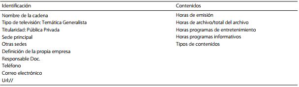 Identificación de la denominación y ubicación de la cadena. Igualmente importante es la persona de contacto con la empresa que, en definitiva, será el encargado de coordinar de forma interna la auditoría de la documentación. Si bien se requiere que esta persona de contacto sea el responsable del servicio de documentación, este deberá estar determinado por la propia cadena televisiva (Cuadro 1).