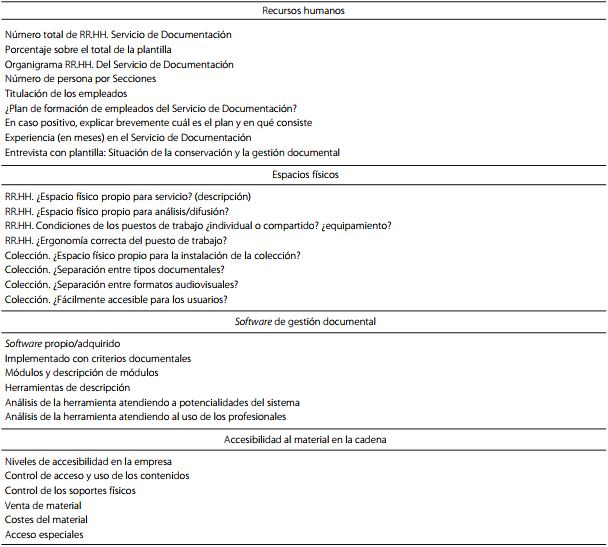 En este apartado se analizarán los recursos humanos propios del sistema documental, ya sean propiedad de la cadena misma o hayan sido externalizados por la empresa. Es indispensable conocer elementos que definan las capacidades y destrezas tanto de los responsables como de los operarios-documentalistas del Servicio (Cuadro 3).