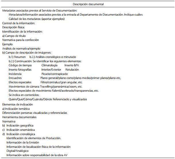 La gestión documental de información audiovisual televisiva es, sin lugar a dudas, un tema complejo derivado de la naturaleza audiovisual del material (Nuño Moral & Caldera-Serrano, 2000), siendo necesario analizar tanto elementos visualizados como aquellos referenciados en la banda sonora y, por supuesto, detectar aquellos mensajes resultados de la unión de la banda imagen y el sonido. Todo ello teniendo presente la necesidad de contar con campos tanto en texto libre como en lenguaje documental controlado (Cuadro 4).