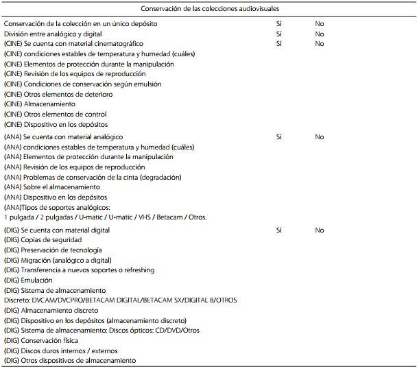 No se presenta una cuantificación en los parámetros evaluados con el fin de determinar hasta qué punto se cumplen normativas o dejan de llevarse a cabo. En su lugar se propone un análisis en conjunto para determinar cuáles son los elementos que deben mejorarse y, sobre todo, para conocer en qué estado se encuentran las colecciones audiovisuales.
