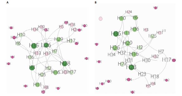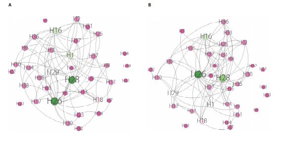 Figures 3A and 3B show the graphs of Type 3 network modeling sharing successful innovative management processes (i.e., providing information). The graphs show that the hospitals H16, H26, and H28 are the ones that the other hospital network members would like to share management information with. In contrast, no organization in the hospital network showed interest in sharing procedures with the hospitals H4, H19, H20, H21, H22, and H24.