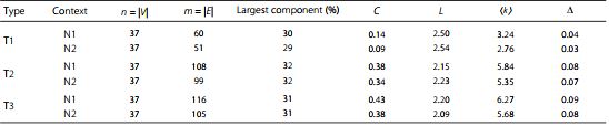 Regarding the Minimum Average Path (L), the results found for T1N1 and T1N2 were 2.5 and 2.54; for T2N1 and T2N2, 2.15 and 2.23; and for T3N1 and T3N2, 2.20 and 2.09, respectively. These values show that the network structure promotes interaction and therefore the flow of interaction despite the low dissemination demonstrated by the Average Clustering Coefficient (C). The average degrees (〈k〉) of the networks show the number of hospitals (i.e., from 3 to 6 hospitals, in this case) with which the hospitals studied interacts (Table 2). This result reinforces the perception of low dissemination in the investigated Network (Cunha, 2012).