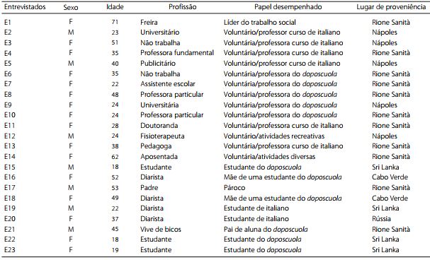 Foram entrevistadas 23 pessoas, das quais 13 voluntários, bem como a líder do trabalho social e o pároco da comunidade, duas mães e um pai de alunos do doposcuola, dois estudantes estrangeiros do curso de italiano e três estudantes do doposcuola. Ressalta-se que foi necessário entrevistar um número maior de voluntários porque a finalidade era compreender como se realiza/funciona o trabalho de integração social. Além disso, percebeu-se que a maioria das pessoas atendidas por essas ações provinham de outros países, o que causou determinado impedimento para o estabelecimento de diálogo pela questão da língua e, por vezes, devido à timidez ou ao receio de alguma retaliação, algo que será explicado mais à frente.