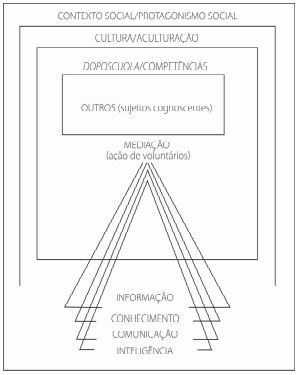 O outro, nesse modelo, são os sujeitos cognoscentes/moradores da Sanità, para os quais as ações educacionais são pensadas e realizadas pelos voluntários e pela líder do trabalho social. Já a mediação (ação de voluntários) atua com intencionalidade e com reciprocidade, procurando respeitar as diferenças culturais e se constituindo como elemento essencial no processo de intervenção humana para assistir a busca de informação e a aprendizagem a partir do acesso e uso da informação, como explica Kuhlthau (1993). Essa intervenção acontece pela interação social, a qual proporciona o desenvolvimento do ser humano, o que ocorre, conforme Vygotsky (1991), quando o desenvolvimento cognitivo mantém estreita relação com a aprendizagem, quando há apropriação do conhecimento produzido pela humanidade e estabelecimento de relações com o meio. Além disso, nesse contexto, é primordial haver um intermediário, um organizador de processos formativos, ou seja, é necessária a atuação do mediador, o qual, de acordo com Belmonte (2007), seria aquele que contribui para a autêntica construção da obra mais complexa que se pode empreender: a formação de uma pessoa.