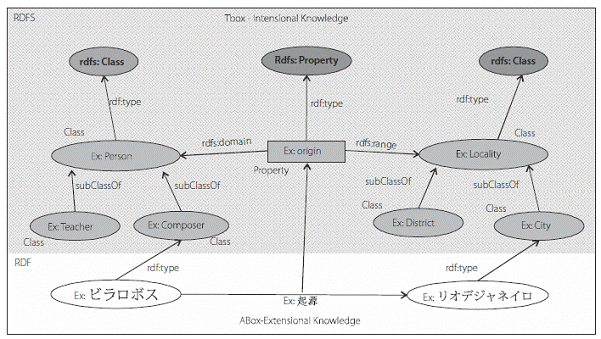 Figure 1 shows the representation of specialization and generalization layers. The first one is commonly referred to as ABox or Assertional Box. For example, the representation of the sentence "Heitor Villa-Lobos was born in Rio de Janeiro" in Japanese would use the particularization, instantiation, or specification of the class 'person'. The second is called TBox or Terminological Box, which contains the domain abstractions that enable inferences about the data model. Thus, in this layer, the relationship between classes and properties introduces the semantics in the data model, which leads to an ontology and translates into the computer world the ideas of Dahlberg (1978) about extension and intension of the concepts that are the basis of ontologies in Information Science.