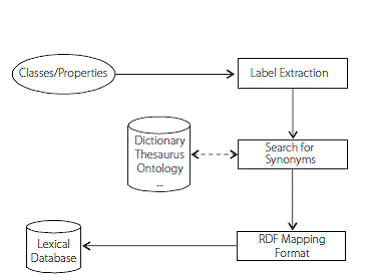 The proposal for the construction of RiscoLex is to extract the labels of classes and properties of the ontology, identify and retrieve their respective synonyms and the morphosyntactic features of each term, convert them into RDF format, and provide the lexical database with the Lemon model. Figure 3 shows the steps of the generation RiscoLex process.