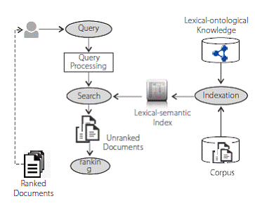 Figure 4 illustrates the information retrieval process with the addition of the semantic module. The user interacts in a traditional way to submit the query. The query processing standardizes the terms for the search. The lexicon-ontological knowledge includes the ontology and the RiscoLex. The corpus characterizes the database containing the documents to be retrieved. The joint indexation of the databases involved provides the lexical-semantic index, which is used in the retrieval and ranking of retrieved documents to be presented to the user.