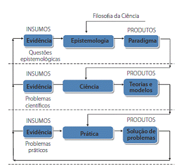 A Figura 1, adaptada de Van Gigch e Pipino (1986), ilustra a hierarquia de sistemas de investigação científica e suas inter-relações, de acordo com a M3. Pelo esquema apresentado, as questões epistemológicas são formuladas a partir de insumos da Filosofia da Ciência, por um lado, e dos níveis científico e prático por outro. Do mesmo modo, as investigações científicas do nível intermediário recebem insumos tanto em forma de paradigmas, determinados a partir de questões epistemológicas, quanto em forma de evidências que emergem do nível prático. As questões práticas, por sua vez, recebem como insumos as teorias e modelos do nível científico e as soluções para os seus problemas (LACERDA, 2005).