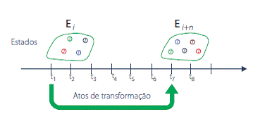 Lima-Marques (2011, tradução nossa) propõe ainda uma extensão do conceito de 'Atos de Fala' de Austin (1975) e Searle (1962): da concepção de que "todo discurso é um ato", deriva que "todo fazer é um ato" e "todo ato é uma transformação". 'Ato de Transformação', por sua vez, é definido como "um conjunto de eventos aplicados a um estado particular, pelo sujeito, para provocar mudanças em estados futuros", conforme ilustrado pela Figura 3.