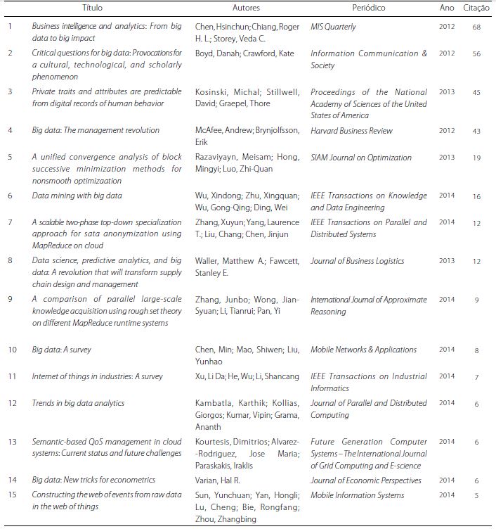 Inicialmente, conduziu-se uma busca na plataforma ISI Web of Science, em junho de 2015, com as seguintes palavras-chave: “big data” OR “big data analytics” OR “big data analysis”, resultando em 5.174 publicações. Destas, 1.673 consistiam em artigos, considerando que a amostra se restringiu a esse formato de publicação. Posteriormente, conduziu-se uma filtragem por temas, com o uso de ferramentas disponibilizadas pelo ISI Web of Science, obtendo-se uma amostragem de 1.132 artigos. Foram excluídos temas relativos à biologia, saúde, medicina, física, literatura, filosofia, dentre outros assuntos não correlatos ao mundo dos negócios. Foram, portanto, considerados temas referentes a manufatura, matemática, computação, negócios, economia e ciências sociais. Desse modo, obteve-se a seguinte restrição: