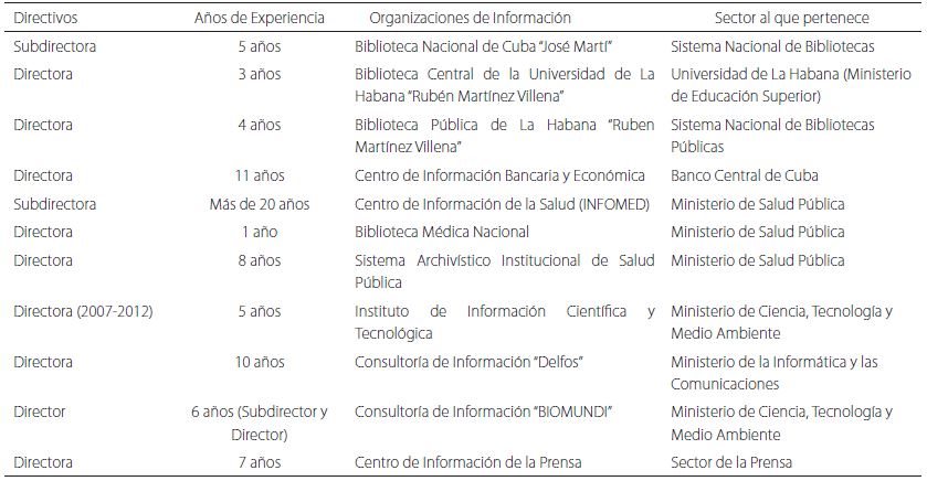 Una vez identificadas las principales características del objeto de estudio de la presente investigación: la información y su uso en la toma de decisiones estratégicas, se seleccionó la muestra de directivos a participar en el estudio. La muestra utilizada es de tipo intencional y consta de once directivos de nivel estratégico de organizaciones de información cubanas de amplio reconocimiento por su impacto en el desarrollo socioeconómico del país (Cuadro 1).
