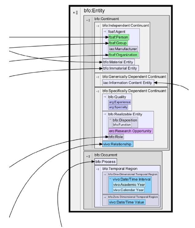 Analisando a Figura 1, pode-se verificar que a classe entidade (Basic Formal [bfo:entity]) é o centro da ontologia, originando a maior parte dos relacionamentos. Outro ponto de destaque são as especificações das classes mais genéricas da ontologia. Essa característica mostra o grau de especificidade que a ontologia e a própria plataforma VIVO apresentam durante a inclusão e descrição dos itens no sistema.