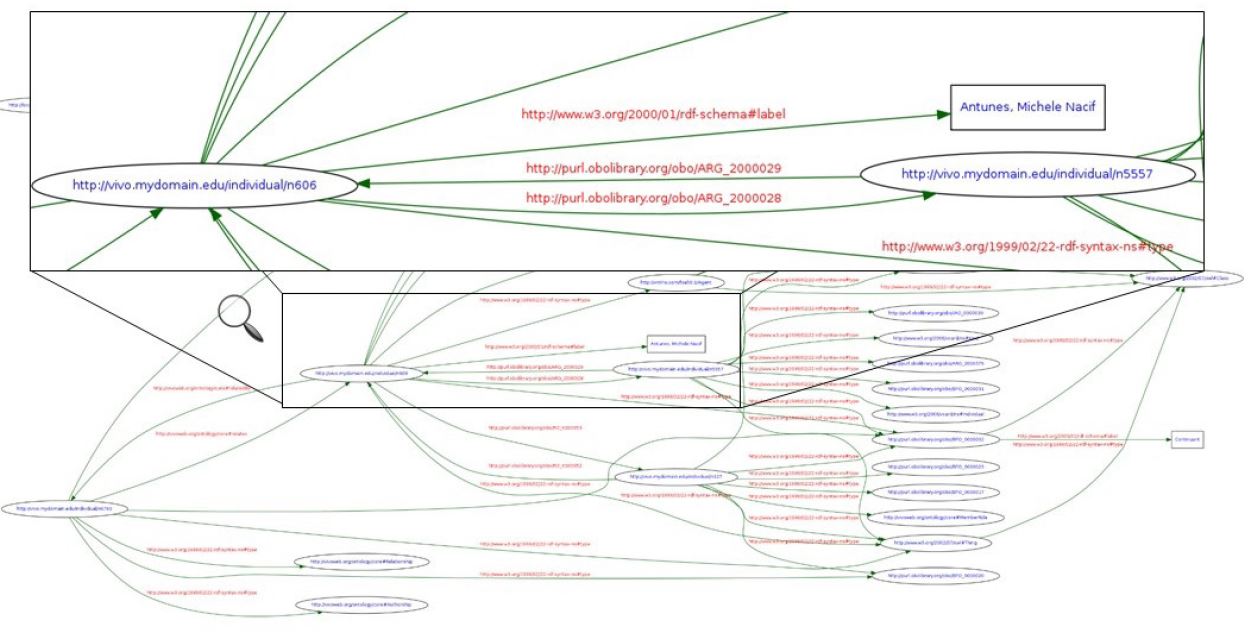 Na Figura 2 visualiza-se como a página de um pesquisador é representada em RDF, por meio de grafos. A Figura mostra que todas as informações estão interligadas, pois se utiliza o RDF como método de armazenamento de informações.
