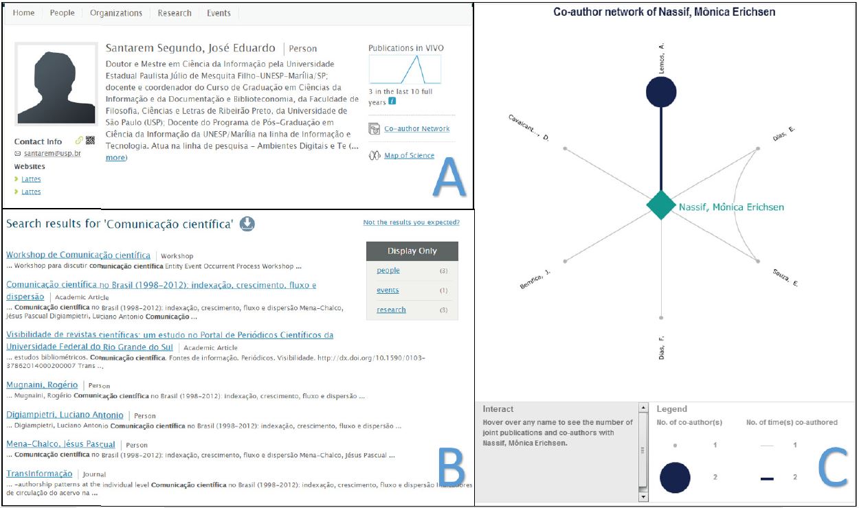 A Figura 3 demonstra diversas interfaces visuais do sistema. Destaca-se o quadro com a letra A, que ilustra o perfil de um pesquisador, disponibilizando ao usuário informações gerais sobre ele, tais como currículo, vínculo institucional, mapa científico, rede de coautoria, dentre outras.