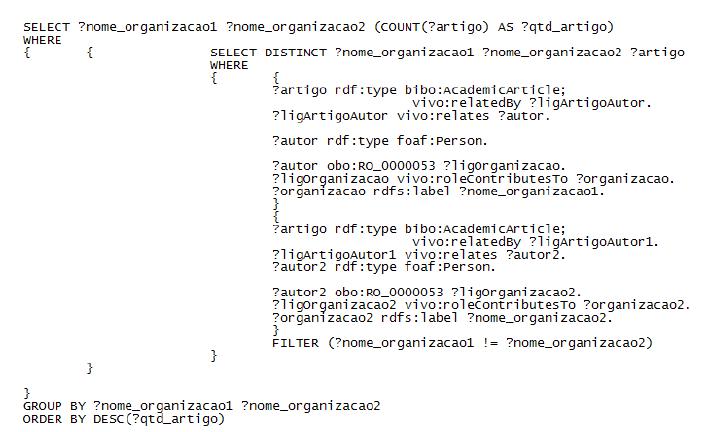 Para a investigação, foram construídas, em SPARQL, diversas consultas de relações bibliográficas, tratadas no final da subseção que apresentou a prova de conceito. Na Figura 4 é possível identificar uma das consultas SPARQL realizadas, cujo resultado apresenta as relações de coautoria entre instituições. Nessa Figura é possível verificar como uma consulta SPARQL é construída, identificando as relações existentes e os recursos que essa linguagem oferece.