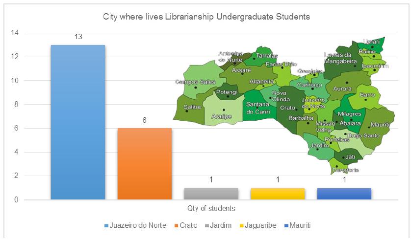 Among these 22 students, 13 were Juazeiro do Norte residents, six of them resided in Crato, one in Jardim, one in Mauriti and one in Jaguaribe, which is in the region of the Jaguaribe Valley, according to Figure 1. Students’ age range included people aged between 18 and 22 (11), 26 and 30 (4), 31 and 35 (1), 41 and 45 (1) and also 2 who were over 51.