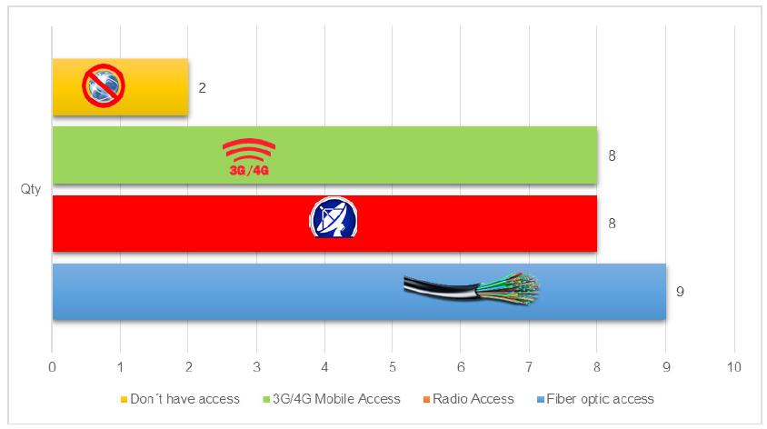 In general, the production of videos requires the video editor user to have access to the Internet in order to search for content that can be incorporated into the video by making a remix of something that has already been produced. Thus, it was sought to know if the students had access to the Internet. Thus, nine students said they had access to the Internet via fiber optic cable, eight via radio, eight via 3G/4G mobile data network and only two said they had no Internet access at home. In addition, it may be mentioned that some students accessed the Internet via more than one technologies. Figure 3 shows the types of Internet access by students.