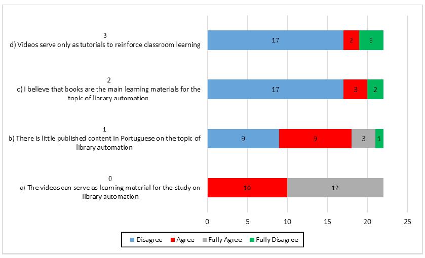 Finally, it is noteworthy that 17 Disagreed when considering that books are the main learning materials regarding the theme of library automation. In order to reinforce this quantitative result it is possible to highlight some comments about the use of the videos for the learning of library automation: