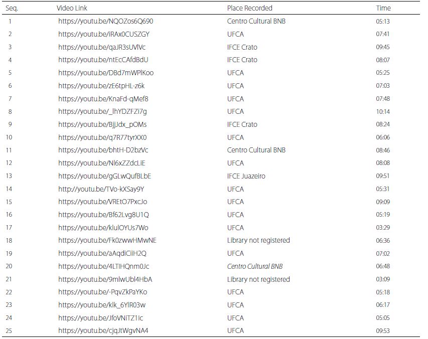 The research population consisted of students who participated in the discipline activities, which were a total of 25 students, yet only 22 answered the questionnaire freely. The Chart 1, the links for the 25 elaborated videos are presented.