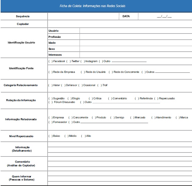 As questões são apresentadas em uma ficha de coleta (Quadro 1), adaptada de Janissek-Muniz, Lesca e Freitas (2006), a fim de facilitar a identificação e a utilização da informação por parte dos analistas das informações ou dos responsáveis pelas decisões.