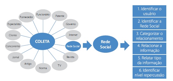 O modelo consiste em responder a questionamentos simples, de maneira formal, em seis etapas, relacionadas às informações disponibilizadas nas redes sociais, comentários, críticas ou sugestões de usuários diversos, pertinentes à empresa, a seus produtos e serviços, aos concorrentes e ao mercado, de forma que seja possível uma triagem das fontes, dados e das informações realmente relevantes para o processo de Inteligência Competitiva (Figura 1).