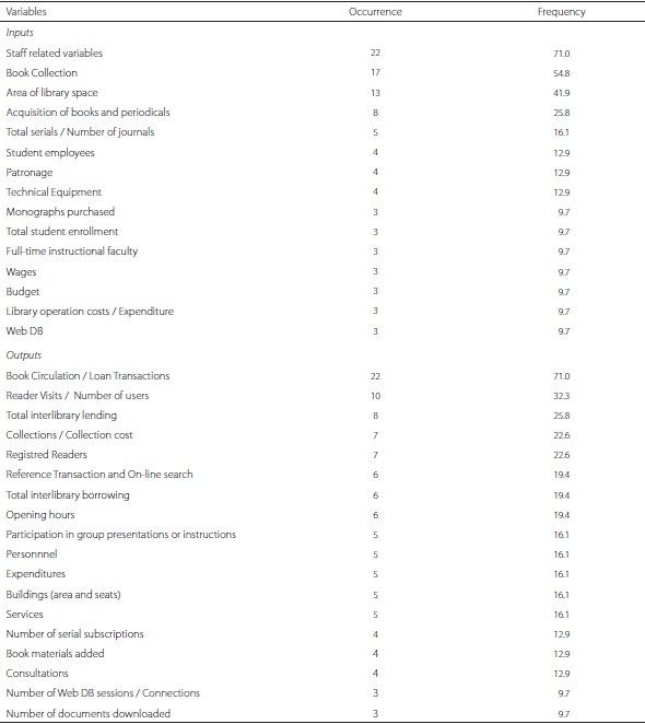 To identify the inputs used in literature, specifically in studies related to checking efficiency in the context of university libraries, and contribute with subsequent studies that intend to develop assessment models in this area, we conducted an analysis of the variables mentioned in Chart 1. Subsequently, the same procedure was performed with the outputs.