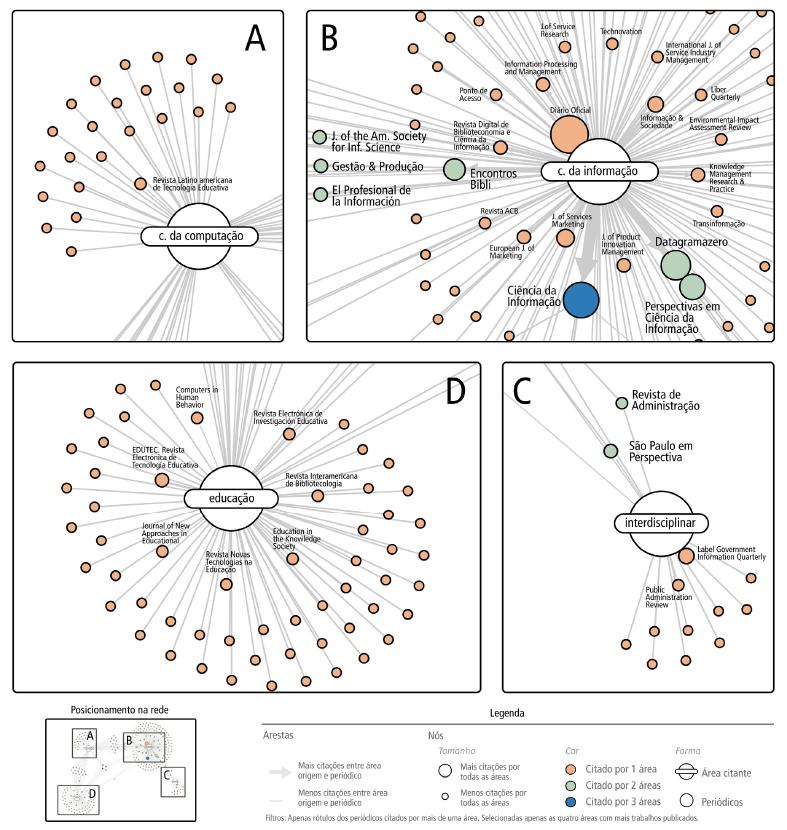 De forma a amenizar o efeito de cauda longa, optou-se pela coleta, referência a referência, do título do periódico citado, o que conferiu maior densidade às relações. Esse indicador tomou a forma de um grafo de citações (Figura 1), no qual as arestas são as ligações entre macroárea de conhecimento (obtida nos metadados do artigo citante) e o periódico citado nas referências. Conforme a legenda, as variáveis contempladas na estrutura são: classe citado e citante (via formato do nó), quantidade de citações (de títulos de periódicos) por todas as macroáreas (tamanho do nó), e quantidade de diferentes macroáreas citantes (cor do nó).
