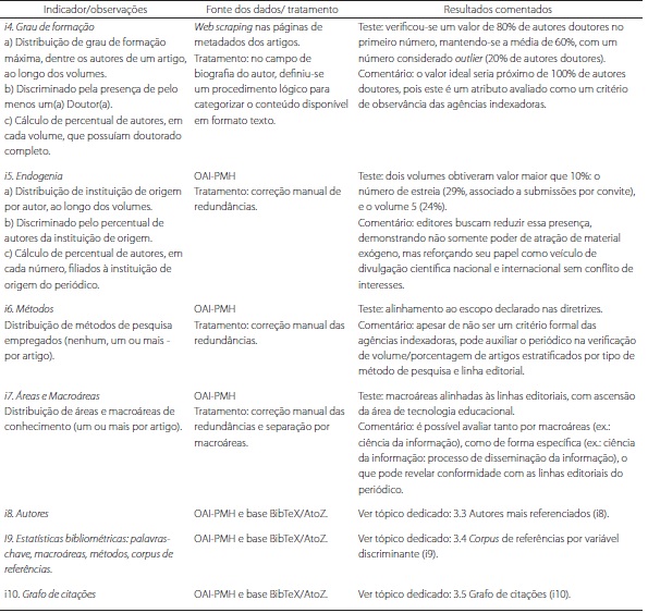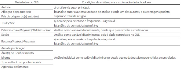No total, foram estruturados, testados e avaliados dez indicadores (Quadro 2), sendo sete deles determinados apenas por metadados do OJS. Cinco indicadores foram considerados como tendo impacto para a presente discussão.