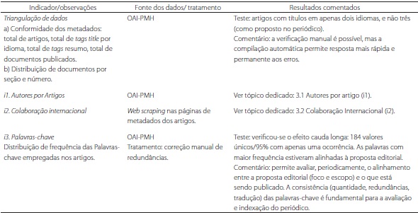 Estudos de natureza bibliométrica - e outros de caráter estatístico -, apresentam resultados diretamente proporcionais à confiabilidade dos dados a serem manipulados. Igualmente, conjuntos mais robustos de dados (decorrentes de alimentação contínua e progressiva) aumentam a capacidade de gestores para projetar metas, estabelecer objetivos e tomar decisões frente às análises derivadas. Editores de periódicos que desejem produzir indicadores domésticos - e habilitar tecnicamente tais periódicos a indicadores externos -, devem estar atentos a tais quesitos de qualidade de dados e à garantia das fontes destes (no caso desta proposta, uma base BibTeX própria e um conjunto de metadados de todos os volumes e números do periódico). Tais condições foram verificadas nos resultados, pois, em quatro dos indicadores propostos (i3 - palavras-chave; i5 - endogenia; i6 - método; e i7 - áreas e macroáreas), foi necessário o tratamento manual para retirar redundâncias, tendo sido feitos testes de consistência voltados à desambiguação. O fato de a investigação ter provocado mudanças na alimentação dos metadados e nos procedimentos de registro na base BibTeX revela-se como um efeito colateral positivo, assim como um alerta para outros gestores que se interessem em repetir o estudo.