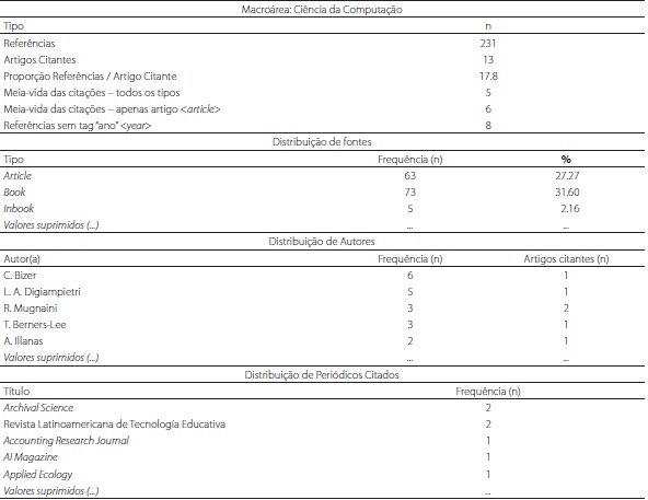 Dada a extensão original dos resultados, apresentam-se - como exemplo da potencialidade na geração de indicadores -, aqueles derivados da variável discriminante “macroárea: Ciência da Computação”, a qual totalizou treze artigos citantes e 231 referências (Tabela 2).