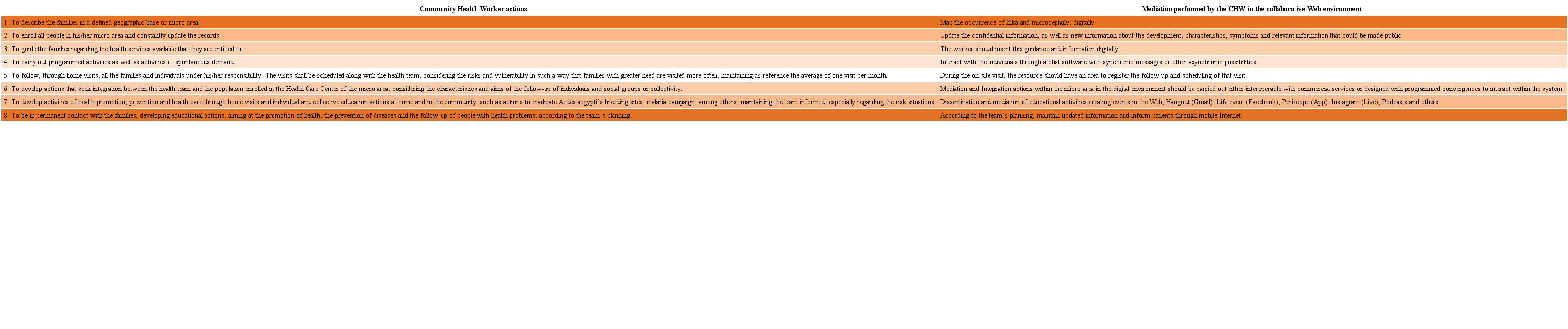 As Health Workers are a new category of workers formed by and for the community, acting and making part of the health services provided in the communities, with attributions (1 to 8) established by law in 2006 (Brasil, 2006), this article suggests expanding the attributions they perform physically to attributions performed in digital environment, creating scalability and contributing for solutions of problems. The suggestion to expand the Health Workers’ role in the digital environment is described below along with the physical attributions established by the law: