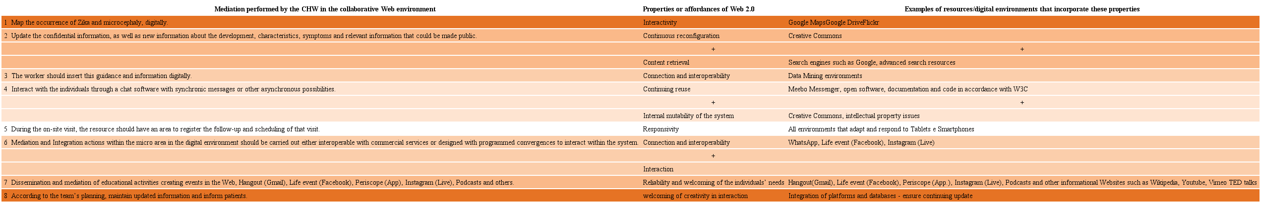 Chart 2 exemplifies the properties or affordances the e-Health digital environment should converge in order to be effective, in line with the attributions the health agent already assumes by law. The suggestion of this paper does not assign more duties to the health agent, on the contrary, from our point of view, the implementation of such platform could facilitate the agent’s work by gathering, in one environment, all the information necessary to perform his/her work. The suggestion of this paper is that the support used to collect information from the families they serve changes from analogic to digital.