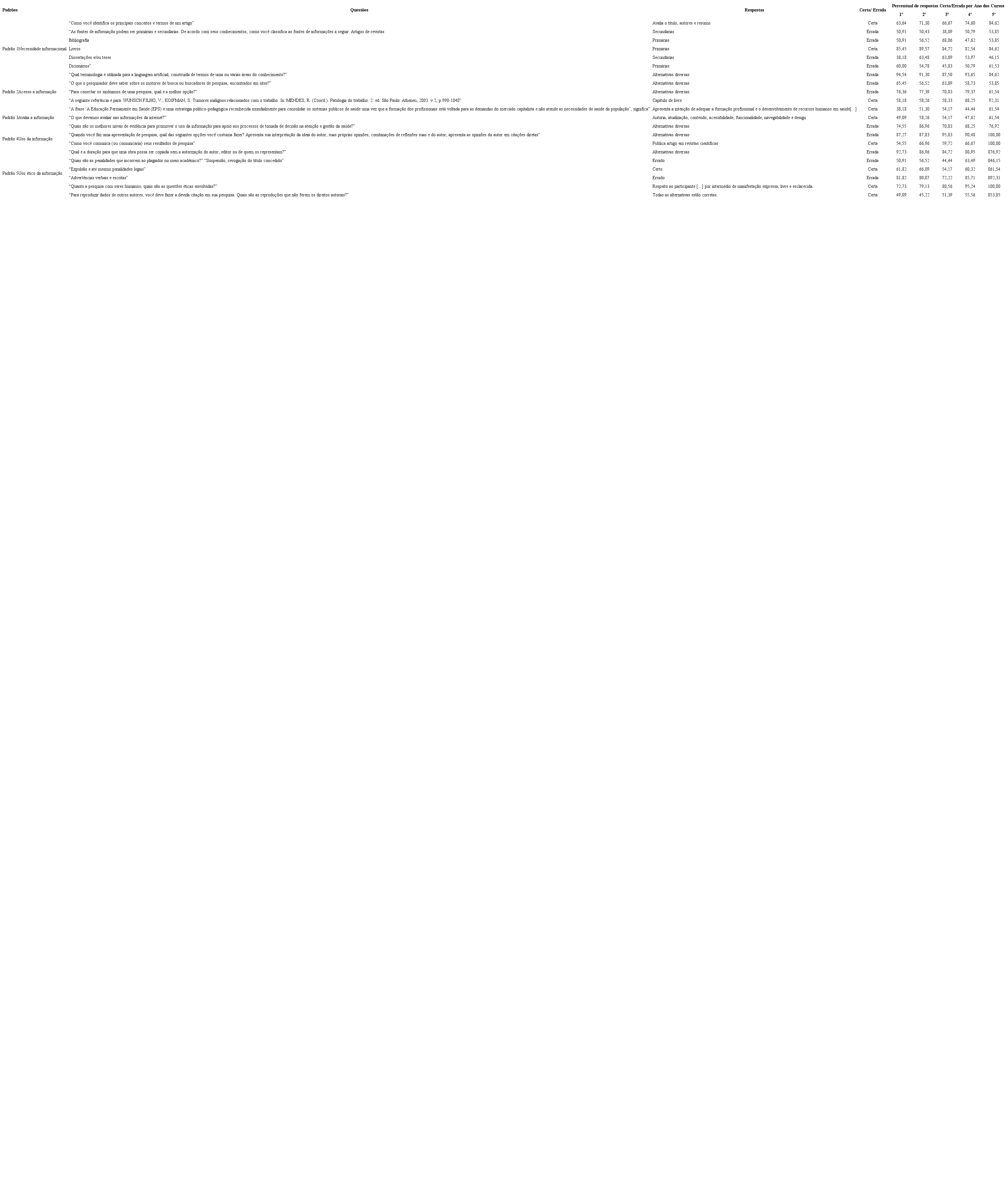 Os dados demonstram que, de modo geral, os estudantes atendem os preceitos básicos da competência informacional, especialmente sobre onde buscar informações científicas de qualidade. No entanto, apresentam dificuldades no que se refere às técnicas de busca e avaliação da qualidade das informações obtidas, bem como o uso ético das mesmas. Por outro lado, observa-se que há uma melhoria crescente dos padrões informacionais conforme o estudante avança nos anos de graduação, como demonstram as Tabelas 1 e 2.