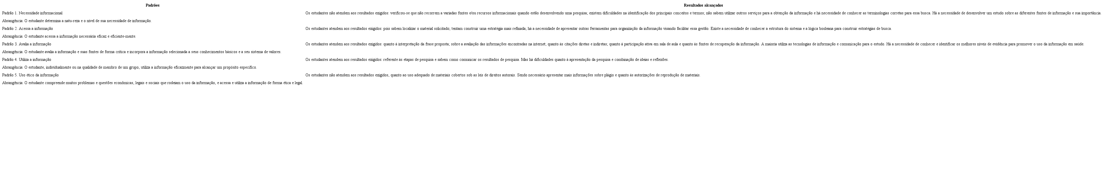 Discute-se a seguir, os resultados conforme os padrões da Association of College and Research Libraries (2000). Em relação ao Padrão 1, que trata da necessidade informacional, percebe-se que as maiores dificuldades se relacionam a etapa inicial de busca da informação, como a identificação dos principais conceitos e termos de um documento, o conhecimento do uso do vocabulário controlado reconhecido pelas bases de dados e outros serviços disponíveis para o acesso a variadas fontes de informação.