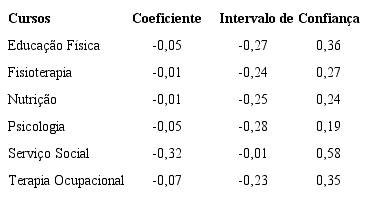 De acordo com a análise inferencial, o curso de Psicologia teve média de acerto maior do que os cursos de Educação Física e Terapia Ocupacional, apenas no 1º ano. O curso de Serviço Social teve média de acerto menor do que o curso de Terapia Ocupacional, apenas no 4º ano.