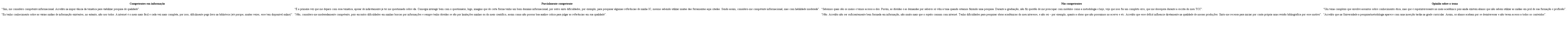 Dos trezentos e dezoito estudantes que participaram do estudo, cento e noventa e quatro responderam a questão aberta, cujos resultados são apresentados no Quadro 2. Ele foi elaborado a partir das falas mais representativas da amostra, conforme as categorias: competentes em informação, parcialmente competente, não competentes no contexto da competência em informação e opinião sobre o tema.