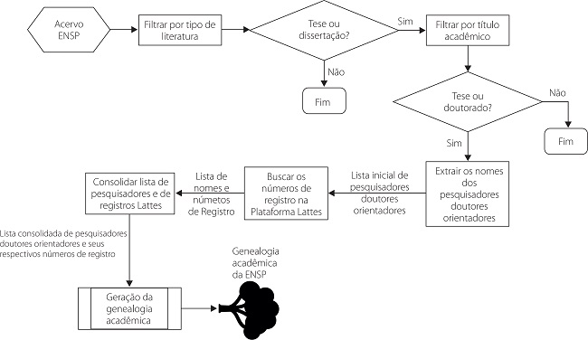 Os acadêmicos relacionados à ENSP foram identificados por meio de análise dos registros do Acervo ENSP, da Biblioteca de Saúde Pública Fiocruz. O Acervo proporciona uma série de filtros, tais como titulação (e.g., doutor ou mestre) e tipo de literatura (e.g., tese ou dissertação), entre outros. Neste trabalho, a busca selecionou tipo de literatura e, posteriormente, autores com título acadêmico igual a catedrático, doutor, livre docência, professor catedrático e professor titular. A busca retornou uma série de nomes de pesquisadores, dentre os quais parte apresentava-se com grafias diferentes, razão pela qual a listagem também passou por uma verificação manual. Os nomes dos pesquisadores orientadores relacionados aos registros do Acervo, resultantes da busca e da filtragem anteriores, foram identificados na Plataforma Lattes, para obter os respectivos Códigos Identificadores (ID) dos currículos.