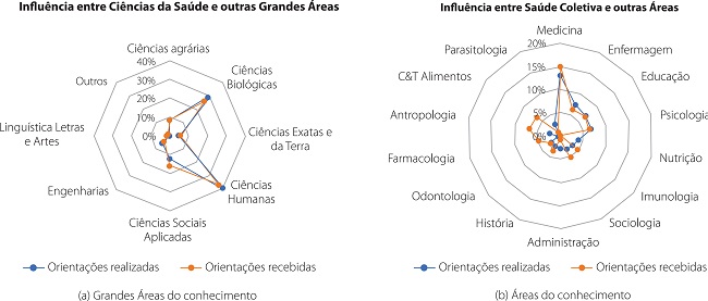 Embora o conjunto da Saúde Coletiva oriente mais e, portanto, influencie mais as demais áreas do conhecimento, há diferenças entre estas e aquela. Assim, o número de orientações realizadas e recebidas é equilibrado entre a Saúde Coletiva e as áreas de Educação, Odontologia e Psicologia. Além da Medicina, as áreas de Enfermagem, Educação e Nutrição são aquelas que mais influenciam a Saúde Coletiva.