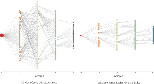 Os valores do índice genealógico fornecem uma avaliação quali-quantitativa da genealogia acadêmica da ENSP. Como destaque, na Figura 4, apresentam-se dois pesquisadores muito influentes na orientação de acadêmicos: a professora Maria Cecilia Minayo, que possui o maior índice genealógico (orientou sete alunos de Doutorado que, por sua vez, orientaram, pelo menos, sete alunos de doutorado, cada um), e o professor Luiz Fernando Rocha Ferreira da Silva, que é o mais antigo pesquisador da ENSP, ou seja, o primeiro acadêmico a formalmente se transferir para a ENSP, na década de 1960.