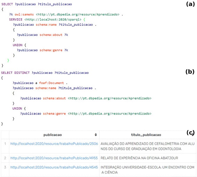 Sobre os ensaios com as duas abordagens de publicação de dados explicadas anteriormente, foram executadas consultas SPARQL nos dois cenários, experimentando os dois bancos de dados RDF (Stardog e GraphDB), com seus respectivos raciocinadores de inferência ontológica habilitados. As consultas foram realizadas tanto usando explicitamente a propriedade owl:sameAs (Figura 5 a) quanto usando inferência com base na semântica da propriedade owl:sameAs (Figura 5 b). As Figuras 5 a e 5 b, apresentam os códigos das consultas SPARQL executadas, recuperando todos os artigos da conferência que estão relacionados, seja por palavra-chave ou por área de conhecimento, ao recurso <http://pt.dbpedia.org/resource/Aprendizado> da DBpedia. A Figura 5 c, mostra o resultado obtido com ambas as consultas no GraphDB, demonstrando, assim, a aplicação bem-sucedida do conceito de Linked Data à base de dados da conferência. Esse resultado promove a reutilização dos dados da DBpedia, disponibilizando dados inteligíveis por máquinas e os incorporando ao grafo mundial da Web de Dados Ligados. O alcance dessa ligação permite, por exemplo, a associação dos artigos da conferência a outros de outras instituições de pesquisa pelo mundo que também possuam recursos de suas bases de dados ligados à DBpedia, fomentando, portanto, o crescimento e a distribuição do conhecimento científico e o apoio à descoberta desse conhecimento.