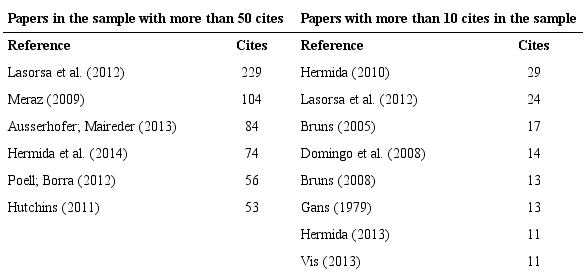 Lasorsa, Lewis and Holton (2012) is the most cited paper on the collected sample and the second most cited work by the analyzed production (Table 1). Its influence is not limited to papers on social media and journalism but is also widely cited in other fields.