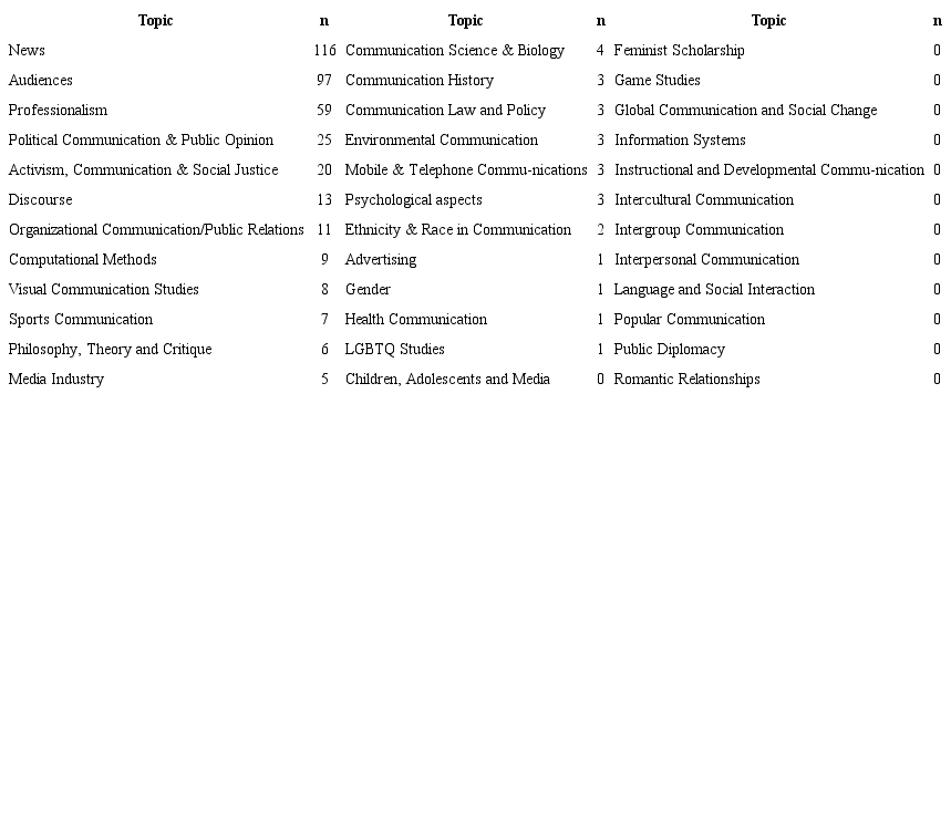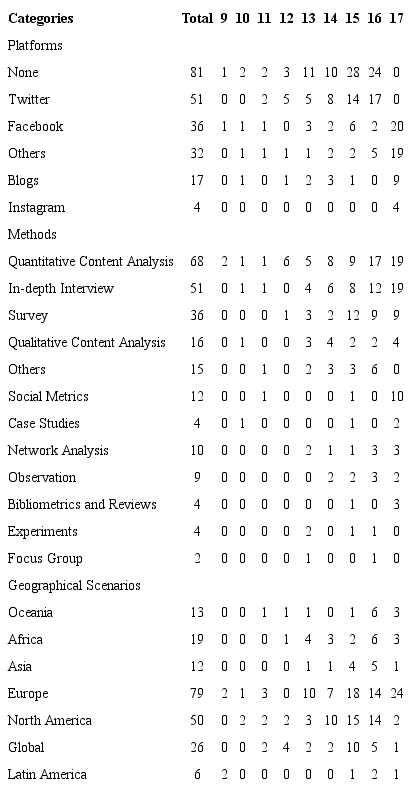 Additionally, the articles were submitted to a manual content analysis which considered the following variables: (1) Methods: included the following categories: quantitative content analysis, in-depth interviews, surveys, focus groups, experiments, observation, case studies, qualitative content analysis and bibliometrics and reviews. After the pre-test, two additional categories were considered: social network analysis and use of social media metrics. Methods like digital ethnography or interventions, which did not reach a minimum amount of five papers were included in the broader category “Other”. Works with no methods, like essays and theoretical reflections were not assigned to any of the previous categories; (2) Geographical scenario: this variable refers to the cultural and geographical precedence of the object studied and the gathered data. For example, if an article addressed sourcing practices of Belgian journalists when reporting Arab Spring events, it was considered that the scenario was Belgium, not Tunisia nor Egypt. This variable considered all the countries and nationalities which were specifically mentioned at the methods section of each paper. Data was recoded according to geographical areas: Europe, North America (United States and Canada), Latin America (including Central and South America, as well as Mexico), Africa, Oceania and Asia. An additional category, “global”, gathered studies whose sample or approach was not limited by geographical criteria; (3) Platform: the specific social media platform analyzed by each study was also recorded. This variable includes the categories: “Twitter”, “Facebook”, “Blogs”, “Instagram” and “None” for those papers which did not consider a specific platform at all. A final category (“Other”) included different sites such as particular political forums or local and regional oriented services such as the Chinese platform Weibo; (4) Topic: categories were identified following the International Communication Association divisions and interests groups and the main topics in the Communication field (Montero-Díaz et al., 2018). Some categories were excluded as they were considered too generic, such as “Journalism Studies”, “Communication and Technology” or “Mass Communication”.An additional category was included (“Professionalism”), to include issues related with journalistic practices, roles, values and education, which were not considered by the initial categories.
