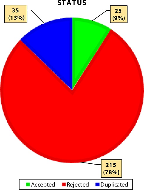 Concluída a etapa da seleção e de extração, foram aceitos 25 artigos, correspondentes a 9% do total da amostra. 35, correspondentes a 13% estavam duplicados. Os outros 215, equivalentes a 78%, foram rejeitados. Os artigos duplicados (contendo mesmo título, autor e ano de publicação) foram rejeitados (Figura 1). Optou-se, para melhor visualização, pela confecção de um quadro-resumo contendo título, autor(es) e ano (de publicação) de cada artigo aceito na Revisão Sistemática da Literatura (Quadro 3).