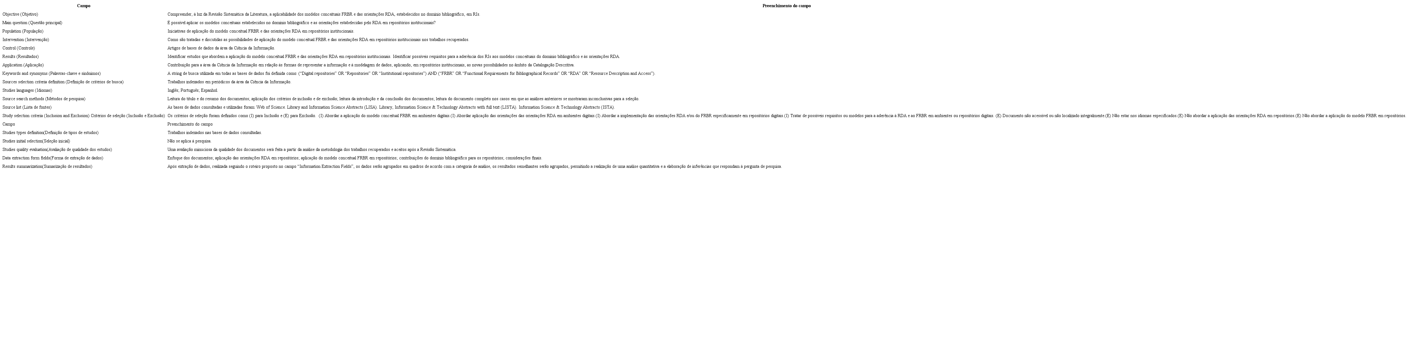 O protocolo de busca, composto no total por dezoito campos que embasam o processo de busca, de seleção e de extração de dados, foi preenchido no próprio software StArt, o qual já apresenta os campos de maneira bem definida e organizada (Quadro 1).