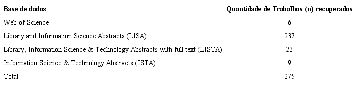 Após definido o protocolo de busca e o seu planejamento, partiu-se para a sua execução, com buscas nas bases de dados selecionadas. Em cada uma delas utilizou-se a string4 de busca: (“Digital repositories” OR “Repositories” OR “Institutional repositories”) AND (“FRBR” OR “Functional Requirements for Bibliographical Records” OR “RDA” OR “Resource Description and Access”). Nessa etapa, a quantidade total de trabalhos recuperados foi de 275 artigos. A divisão dos trabalhos recuperados por base de dados é contemplada no Quadro 2.
