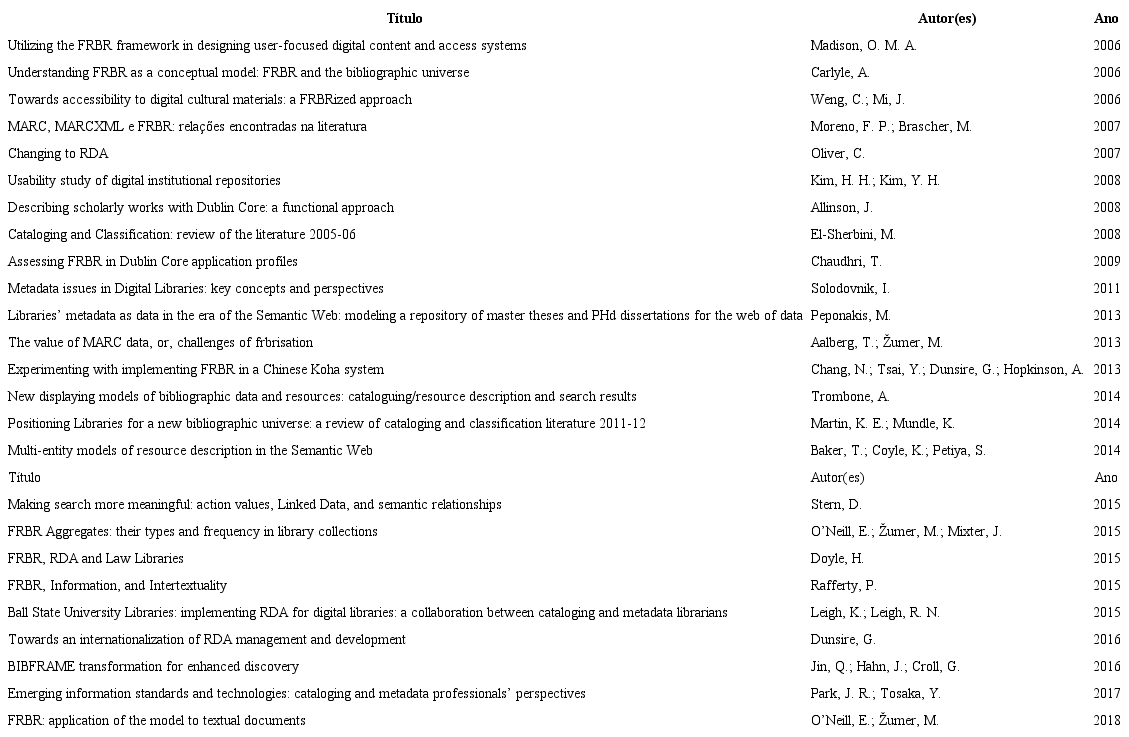 A revisão supracitada, a partir da análise aprofundada e minuciosa dos documentos aceitos, permitiu responder se os FRBR e as orientações RDA podem ser aplicados ou adotados em repositórios institucionais digitais, e identificar casos de uso ou modelos de aplicação de metadados, assim como tecnologias informacionais e computacionais.
