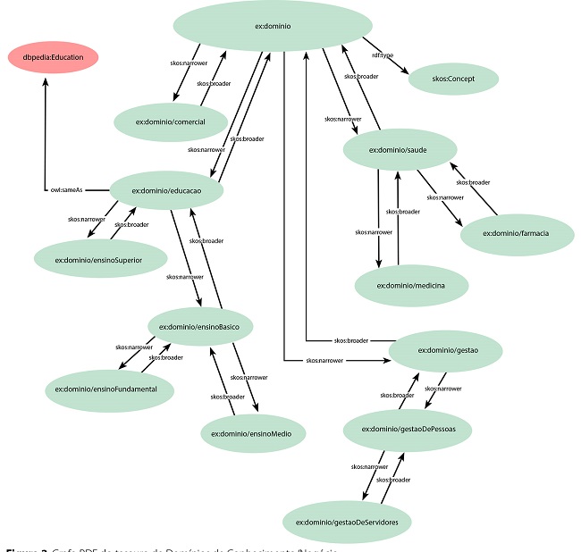 A propriedade skos:narrower indica um conceito mais específico, e a propriedade inversa skos:broader indica um conceito mais geral. Com a propriedade owl:sameAs é estabelecida uma ligação com o recurso externo “educação” da DBpedia, perfazendo o Linked Data mashup, permitindo que o usuário possa consultar mais informações sobre esse domínio (reúso de informações).