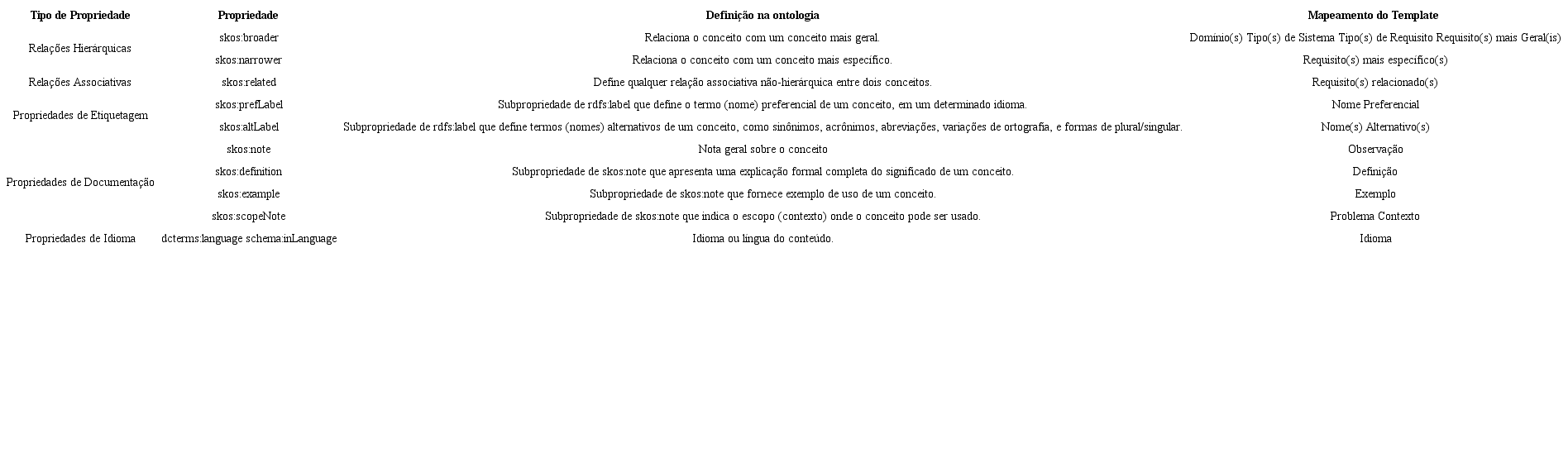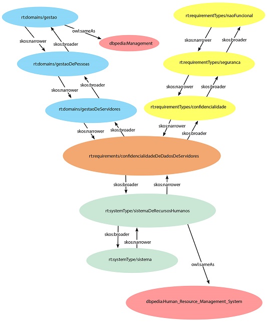 Sob o ponto de vista hierárquico, na Figura 3, o requisito "Confidencialidade de Dados de Servidores" é um subconceito do conceito de domínio “Gestão de Servidores”, bem como do tipo de requisito "Confidencialidade". Por exemplo, na ontologia SKOS, a propriedade skos:broader é definida como subpropriedade da propriedade skos:broaderTransitive, que, por sua vez, é uma propriedade transitiva. Com isso, ao relacionar, por meio da propriedade skos:broader, esse requisito ao tipo de requisito “Confidencialidade”, a máquina infere automaticamente que o requisito também é do tipo "Segurança" e "Não Funcional", relacionando-o diretamente com esses supertipos, por meio da propriedade skos:broaderTransitive. Assim, configura-se uma rastreabilidade via inferência ontológica (esta vale para todos os relacionamentos skos:narrower e skos:broader).