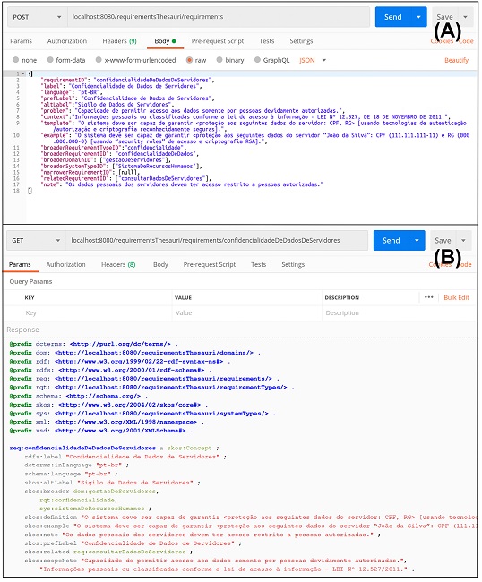 A Figura 4 exemplifica o uso do Web service desenvolvido. Figura 4A apresenta a inserção (método HTTP POST) do recurso correspondente ao requisito “Confidencialidade de Dados de Servidores”, representando os dados de entrada em JSON. Já Figura 4B mostra a posterior recuperação (método HTTP GET) desse mesmo recurso, obtendo sua representação RDF na sintaxe Turtle.